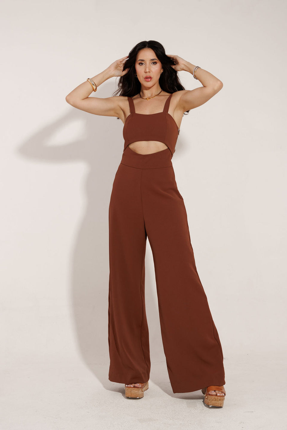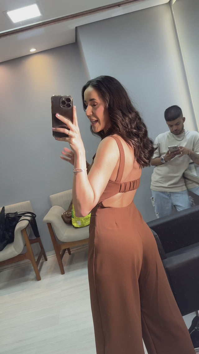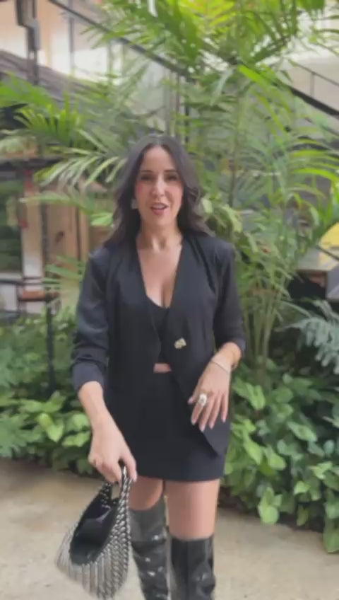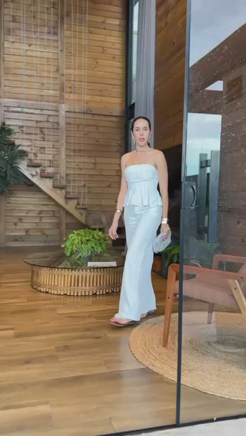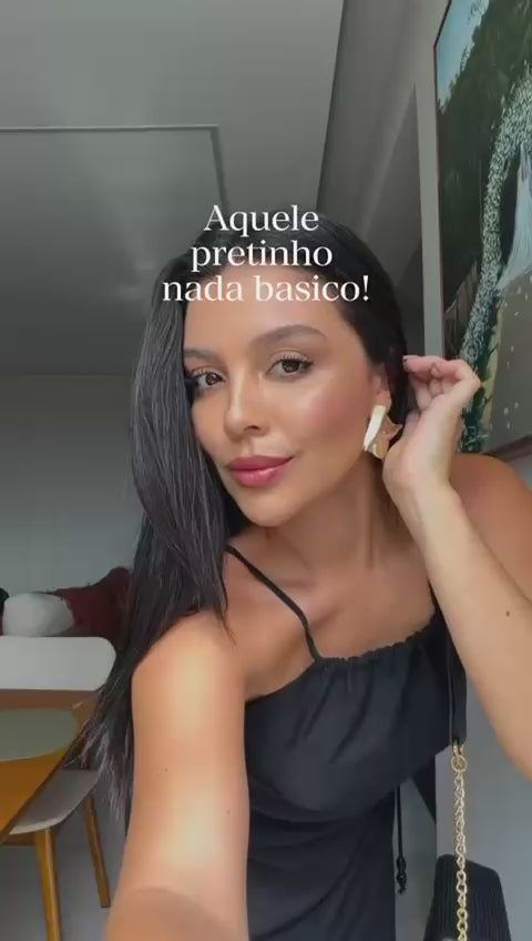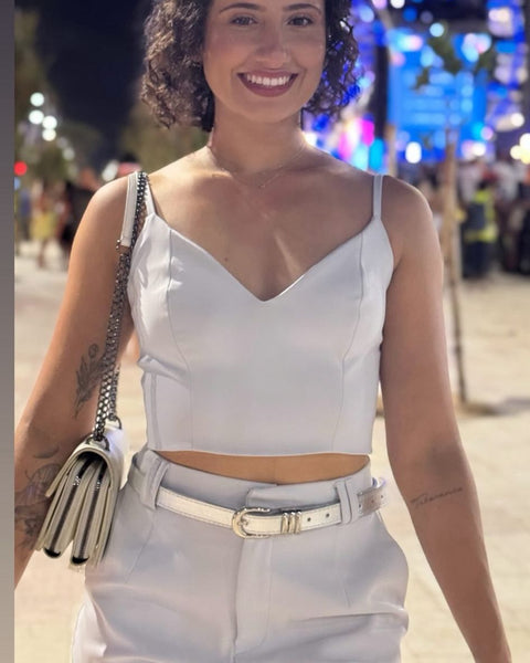 O design moderno traz um top estilo bustiê estruturado com um sofisticado recorte frontal, que valoriza a cintura com elegância.