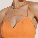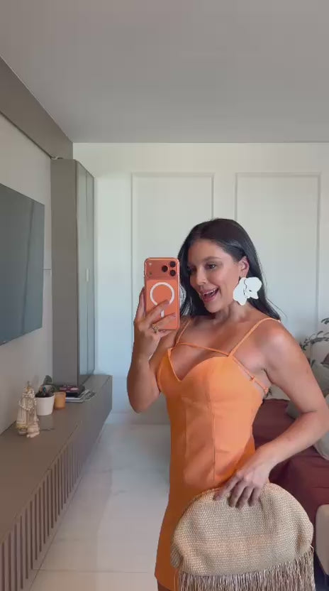 O decote geométrico frontal e as costas abertas conferem um ar ousado na medida certa, perfeito para quem busca um visual marcante e sofisticado.Confeccionado em mistura de viscose e linho, o tecido proporciona caimento leve, conforto e toque natural, com forro interno em poliéster que garante melhor estrutura à peça.