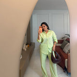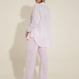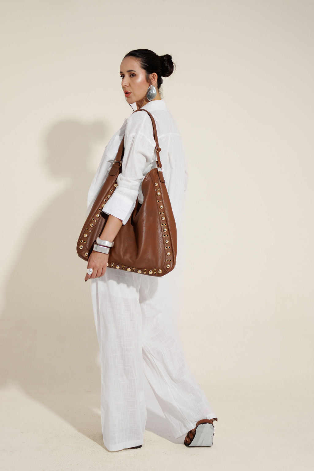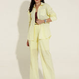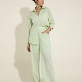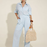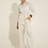 A camisa oversized apresenta caimento solto e fluido, com gola estruturada, fechamento frontal por botões e manga longa com punho reto, trazendo harmonia entre o clássico e o casual chic. Já a calça pantalona possui cintura alta com elástico rebatido, que oferece ajuste confortável e valorização da silhueta. Com forro na parte inferior e bolsos funcionais, o modelo une leveza e praticidade sem abrir mão da sofisticação.