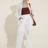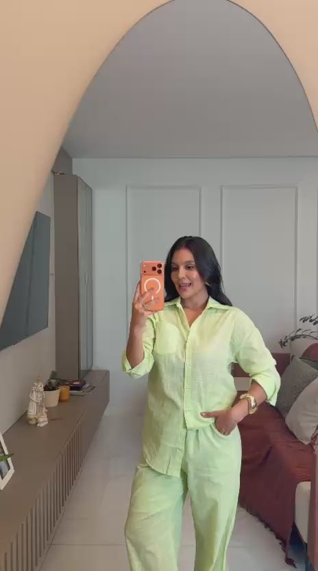 O acabamento texturizado do linho confere um aspecto natural e elegante, tornando o conjunto perfeito para produções descomplicadas e refinadas.