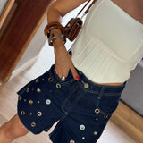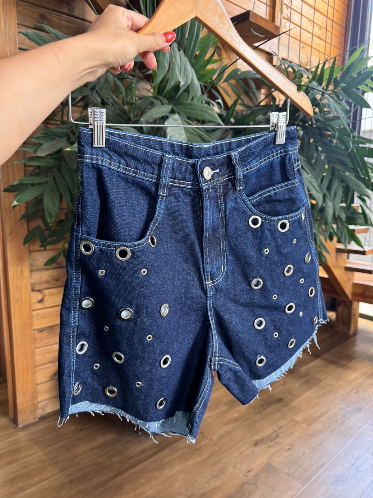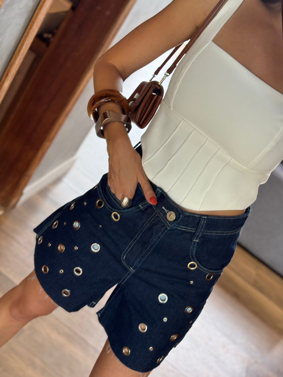 A Bermuda Jeans com Ilhós Prata é aquela peça moderna, estilosa e cheia de personalidade que transforma qualquer look básico em uma produção marcante. Confeccionada em jeans 100% algodão, ela possui estrutura encorpada e caimento impecável, oferecendo conforto e estilo para o dia a dia.