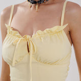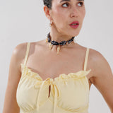 O cropped complementa o conjunto com um toque romântico e delicado. Possui lastex nas costas, proporcionando excelente ajuste, enquanto a parte frontal conta com busto levemente franzido, criando um efeito suave e feminino. As alças finas com regulagem permitem ajuste personalizado, garantindo conforto e segurança.