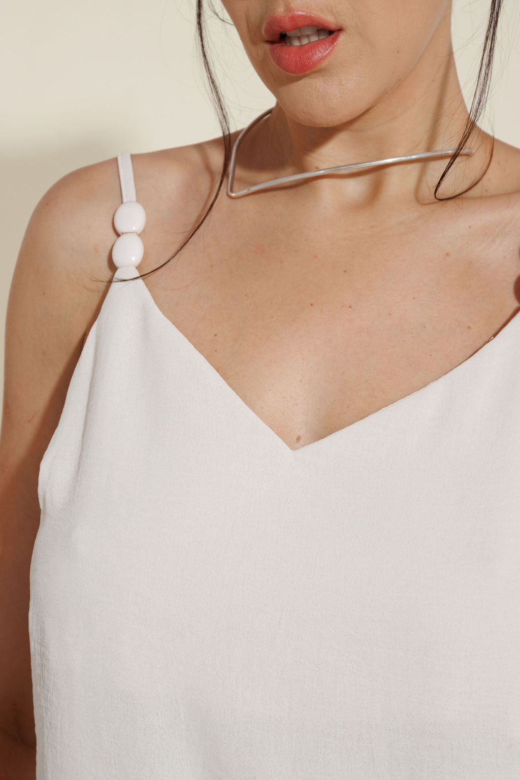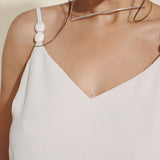 Seu design apresenta decote em V estruturado e duas alças finas sequenciais forradas, com ajuste e detalhes arredondados, realçando a delicadeza do colo, além de valorizar a silhueta com simplicidade elegante.
