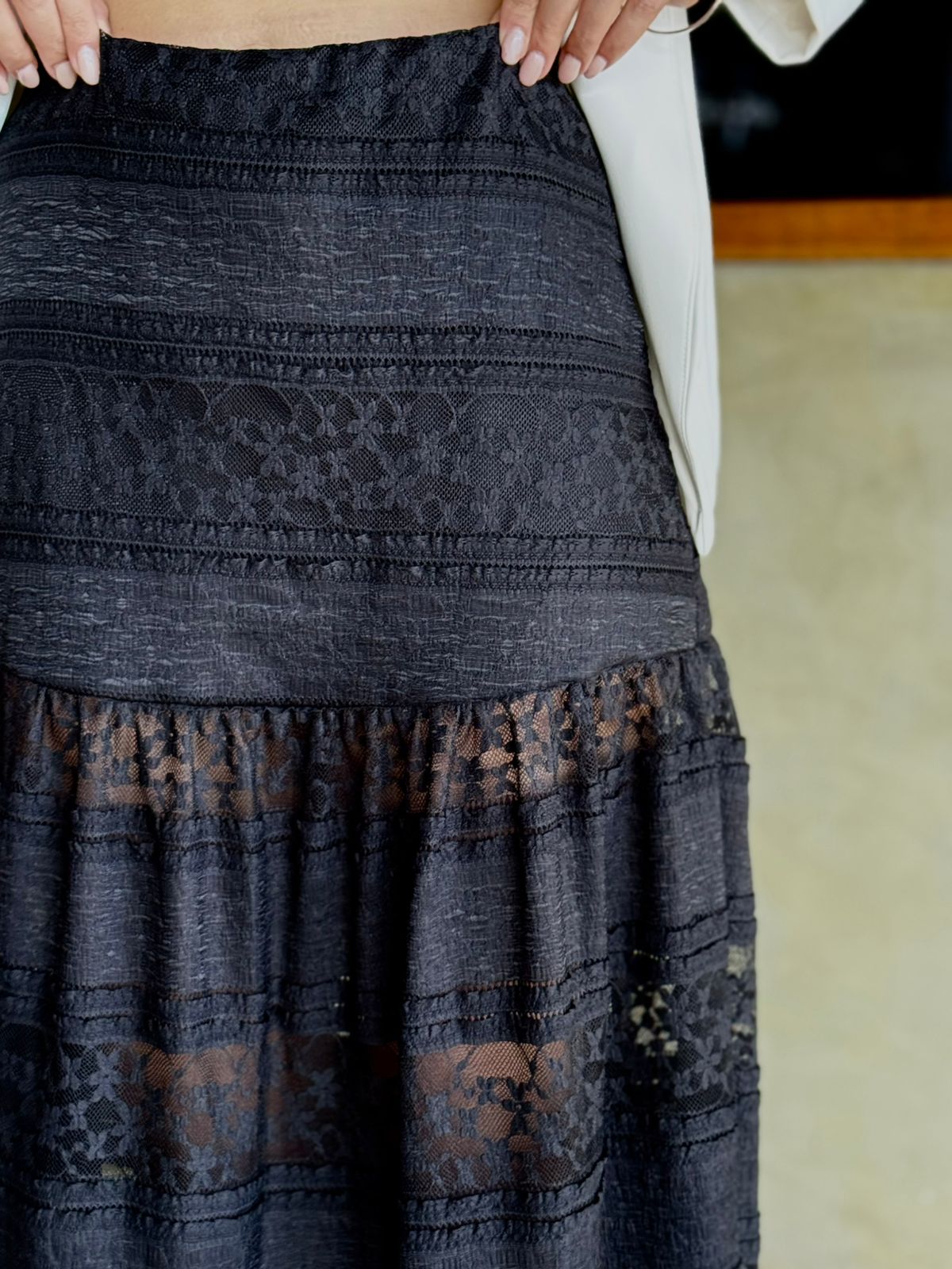 O grande destaque está na renda:Dois estilos que conversam entre si.Uma parte mais desenhada e rica em detalhes, e outra com transparência estratégica, criando um contraste moderno e nada óbvio.