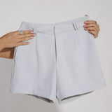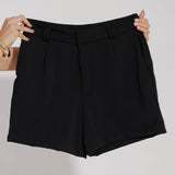 O design moderno apresenta uma modelagem soltinha e confortável, com pregas frontais que garantem um caimento perfeito e valorizam a silhueta sem apertar. Seu corte mais estruturado e o cós clássico e liso com passantes criam um visual sofisticado. O short é finalizado com bolsos laterais funcionais, unindo praticidade e estilo. O resultado é um look versátil, fácil de combinar e que transita do casual chic ao elegante sem esforço.