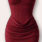 Feminino, elegante e com design que valoriza o corpo. Este vestido curto sem alças possui busto estruturado em meia taça, que oferece melhor sustentação e realça o colo com sofisticação. A saia conta com sobreposição de camada com pregas, criando movimento, textura e um efeito visual que destaca a silhueta de forma moderna e sensual.