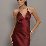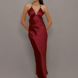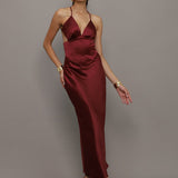 Elegante, versátil e marcante. Este vestido longo é confeccionado em tecido acetinado de toque macio, com caimento fluido que valoriza a silhueta e traz sofisticação imediata ao visual. O decote em V alonga o colo, enquanto as costas abertas com alças finas cruzadas garantem um toque moderno e sensual na medida certa.