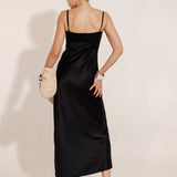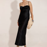 Com brilho acetinado e caimento fluido, ele se destaca pelo estilo slip dress, que alonga a silhueta e traz um ar moderno e minimalista.